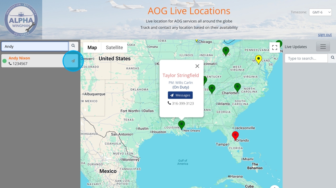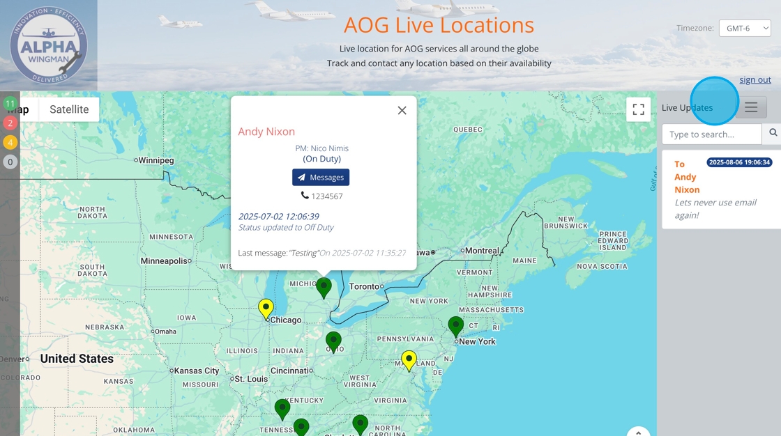Click the Live Updates button at the top of the screen to open the section. The Live Updates area shows technicians who have been active or updated in the past 24 hours, giving you real-time visibility into recent activity.